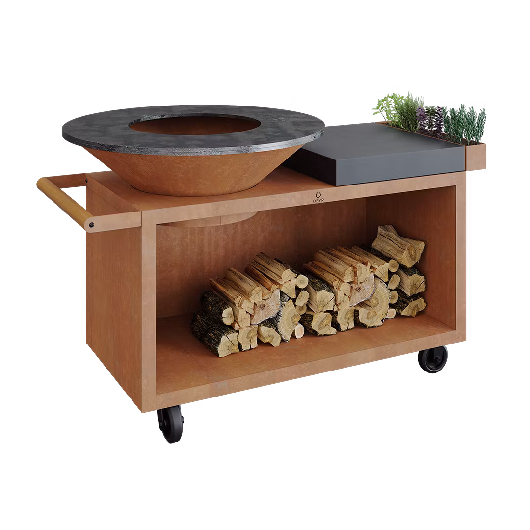 OFYR Island PRO är den bredare samt mobila versionen av OFYR Island 100. Tack vare hjulen så kan man använda den på dom flesta underlagen. Inkluderat finner du en stadigt skärbräda i keramik, ett praktiskt flaskställ för tillbehör samt gott med utrymme för att förvara ved.