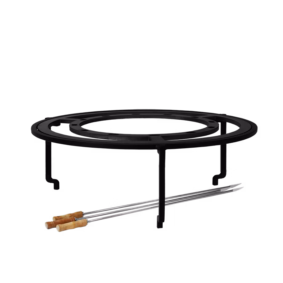 Gör om din OFYR XL eller OFYR Trailer till en brasiliansk grill med detta set som innehåller tre spett i ett cirkulärt ställ av stål. Spetten har trähandtag för enkel hantering och möjliggör långsam tillagning av kött direkt över elden.