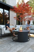 Ett stilrent utomhusbord med en gasoldriven eldstad i mitten som skapar både värme och en stämningsfull atmosfär. Gasolbehållaren förvaras diskret i skåpet under bordsskivan, och den skyddande glaskåpan runt elden kan enkelt lyftas av vid behov.