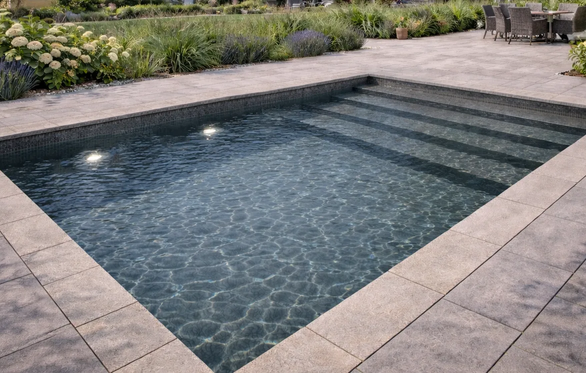 UtseendeDet finns flera olika poolstorlekar att välja på. Bestäm sedan om du vill ha trappa eller stege för att komma i och ur poolen. En av de detaljer som mest påverkar poolens utseende är linern (poolduken). Det finns flera färger och mönster att välja mellan. Linern hänger man i när betongen har härdat och går att byta ut senare om du vill förnya din pool.