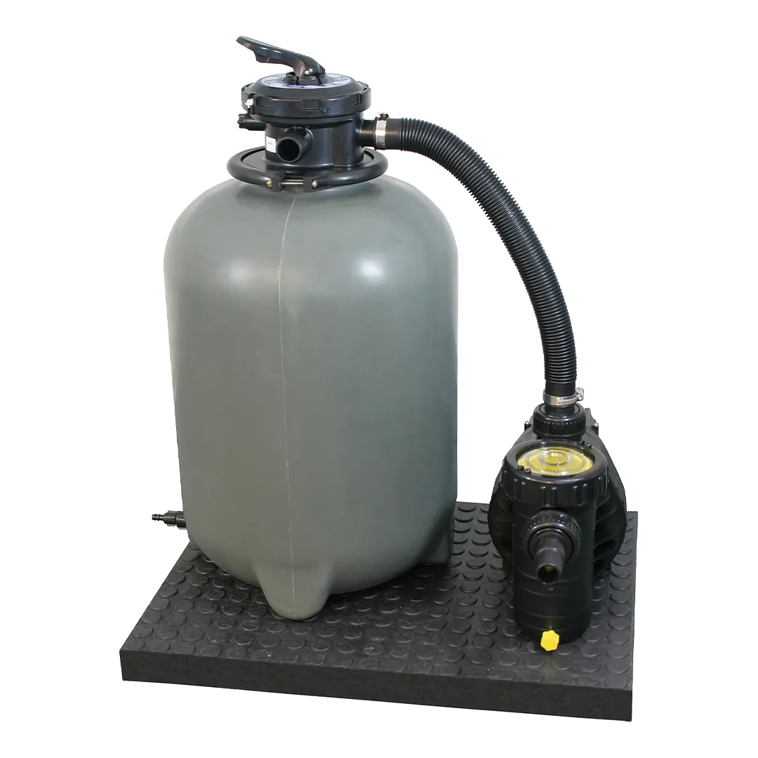 Planet Pool filteranläggning i storlek L med slangkoppling. Grå mattlaminerad polyestertank och cirkulationspump. Högsta kvalité kombinerad med en komfortabel öppning för enkel hantering. Integrerad avtappningsventil för vatten/sand och skruvad toppöppning.