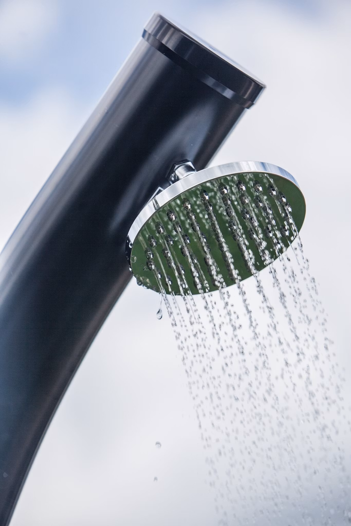 En soldusch är miljövänlig, kostnadseffektiv och har många fördelar. Den värmer vattnet med hjälp av solens strålar och genom att duscha innan ett bad så försvinner mycket smuts, vilket ger en lägre kemikalieförbrukning. Denna dusch i PVC har en snygg böjd design i svart och värmer 20 liter vatten. Kan anslutas via trädgårdsslangen eller fast rördragning, bör dock tas in under vintern. Ca 215 cm hög.