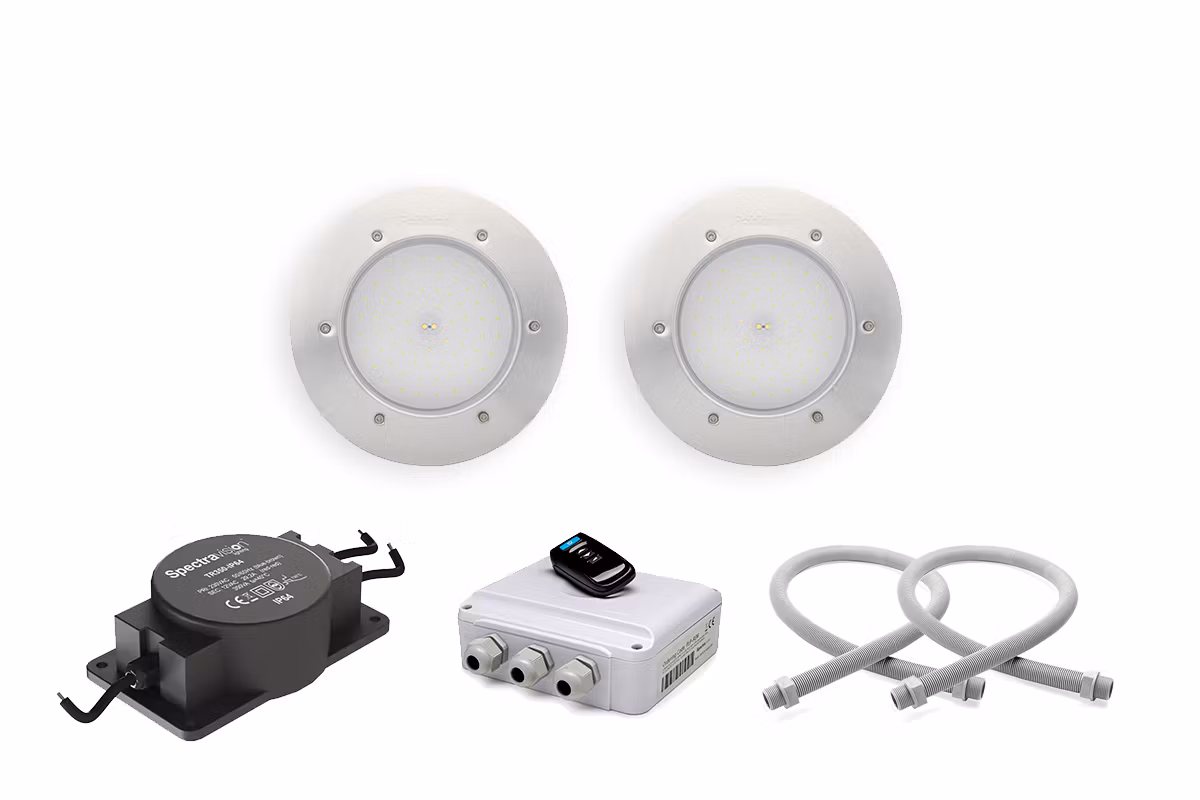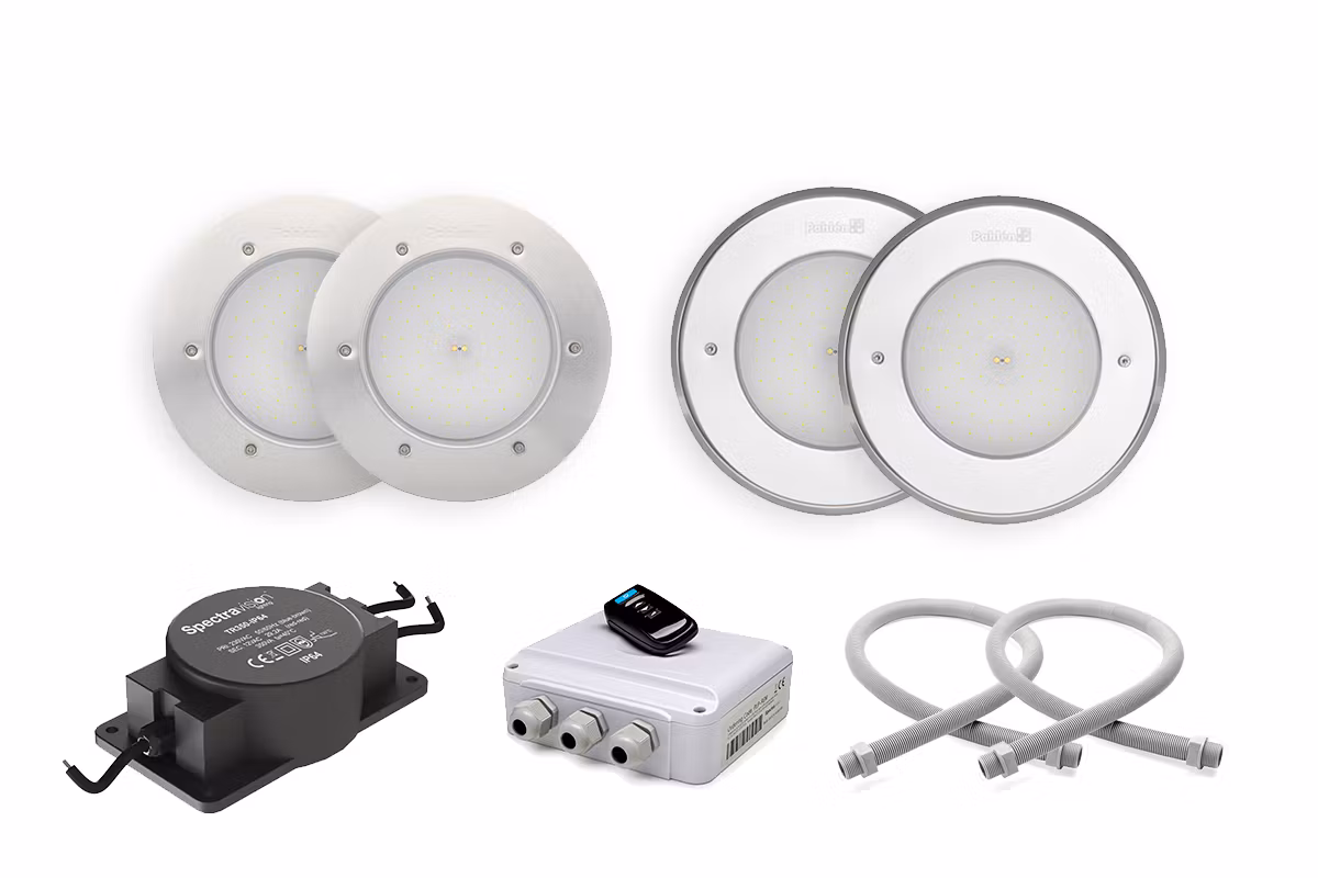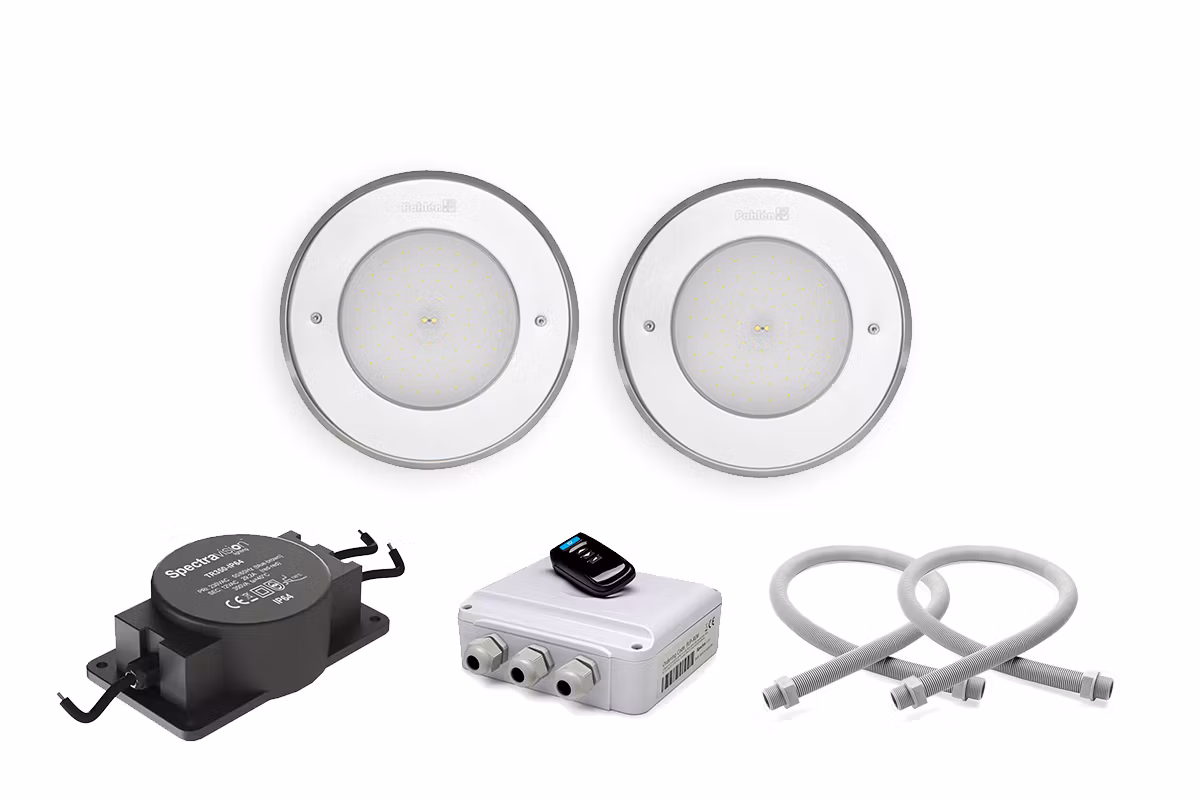 Varje paket innehåller två (2) kompletta poollampor i valfri design (Classic eller Marine) med vår 170VS RGB LED 34,5W med ett ljusflöde på 2100 lumen och 11 olika färgprogram varav 4 nyanser av vitt. Dessa ljuskällor är ej dimbara.